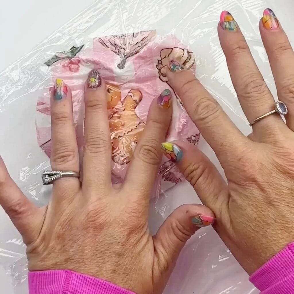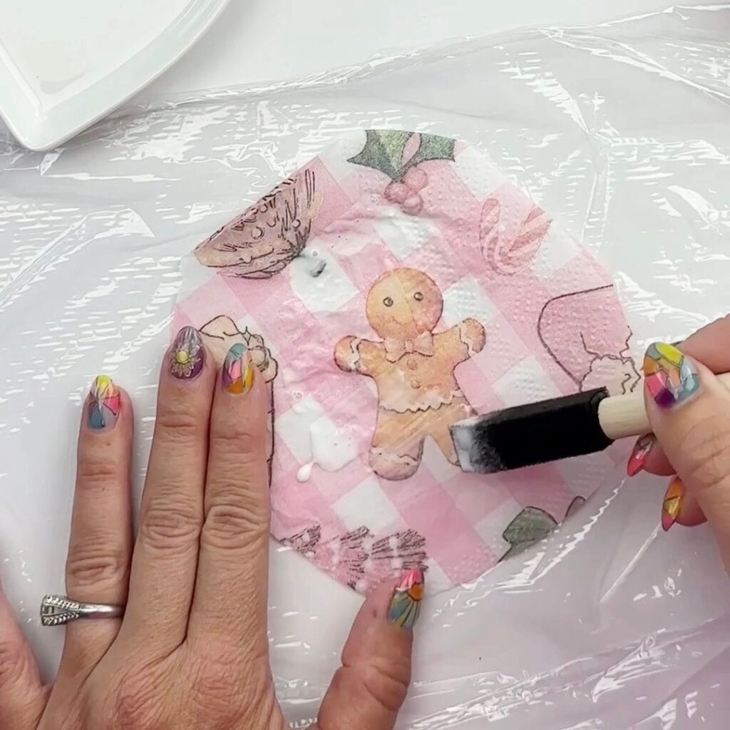 Step 4. Lift the plastic wrap and flip it so the napkin is facing up, then set it onto the surface you’re decorating. While the plastic wrap is still on top, use your fingers to press down and gently smooth out any wrinkles or air pockets.