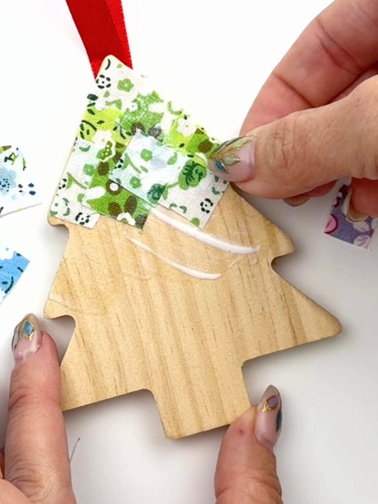 If some of the fabric goes over the edge of the ornament, it’s easiest to trim it before you glue it down completely. You can also trim it afterwards but it can be difficult to get close to the edge.