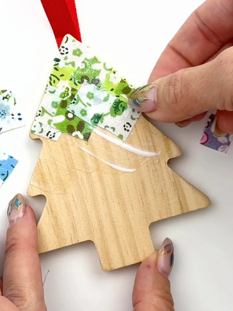 Start layering your fabric shapes onto the glued surface, gently pressing each piece down and smoothing out wrinkles. Slightly overlap the pieces as needed to fully cover the ornament.