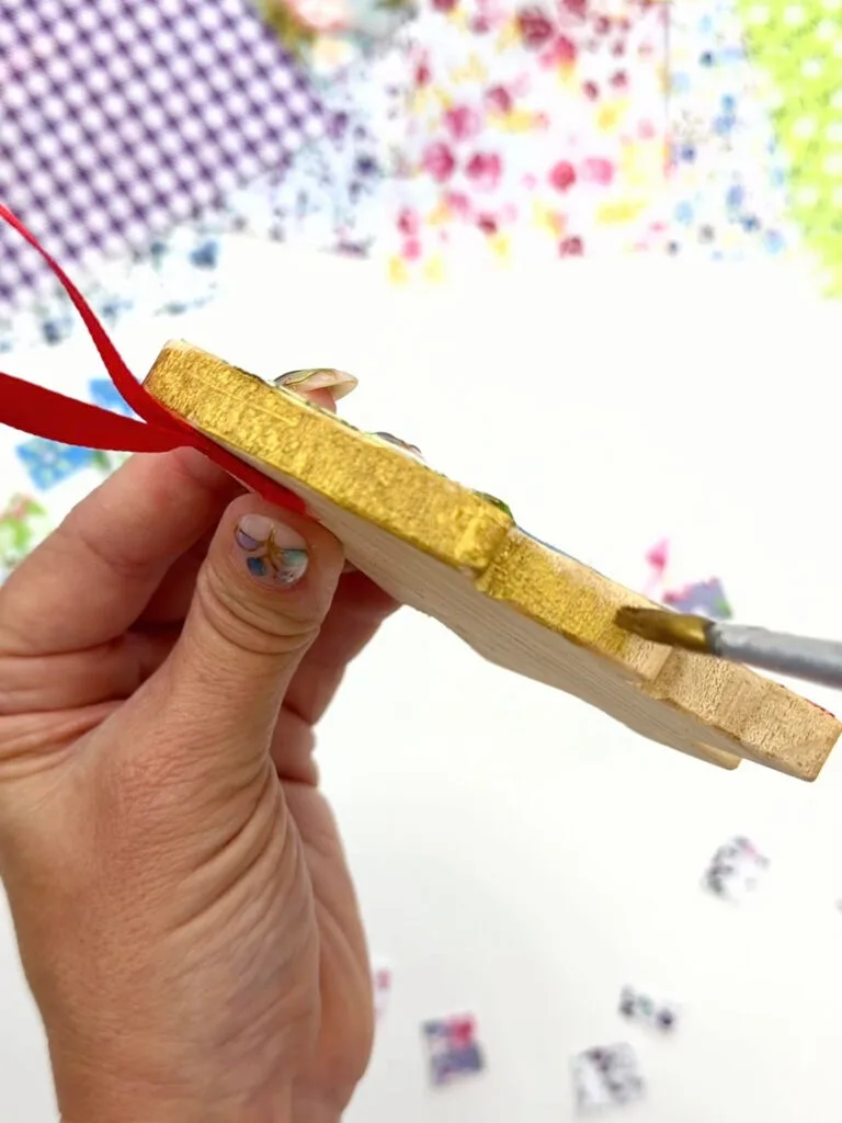 Using a small brush, apply Mod Podge to one section of the wooden ornament. I like to work in small sections so the glue doesn’t dry before the fabric is placed.