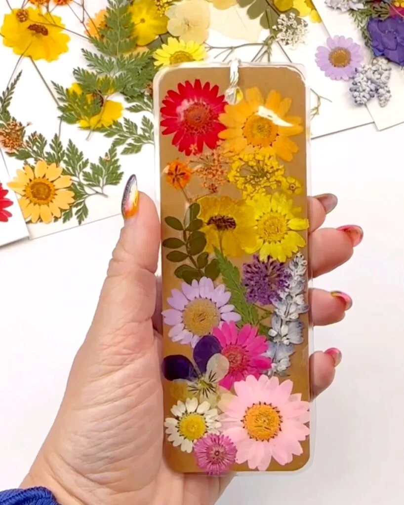- Bookmarks – Use pressed flowers to create beautiful and delicate bookmarks to place in your favorite book. You can add the flowers to bookmark resin molds or simply glue them onto cardstock and protect them with lamination. See full tutorial.