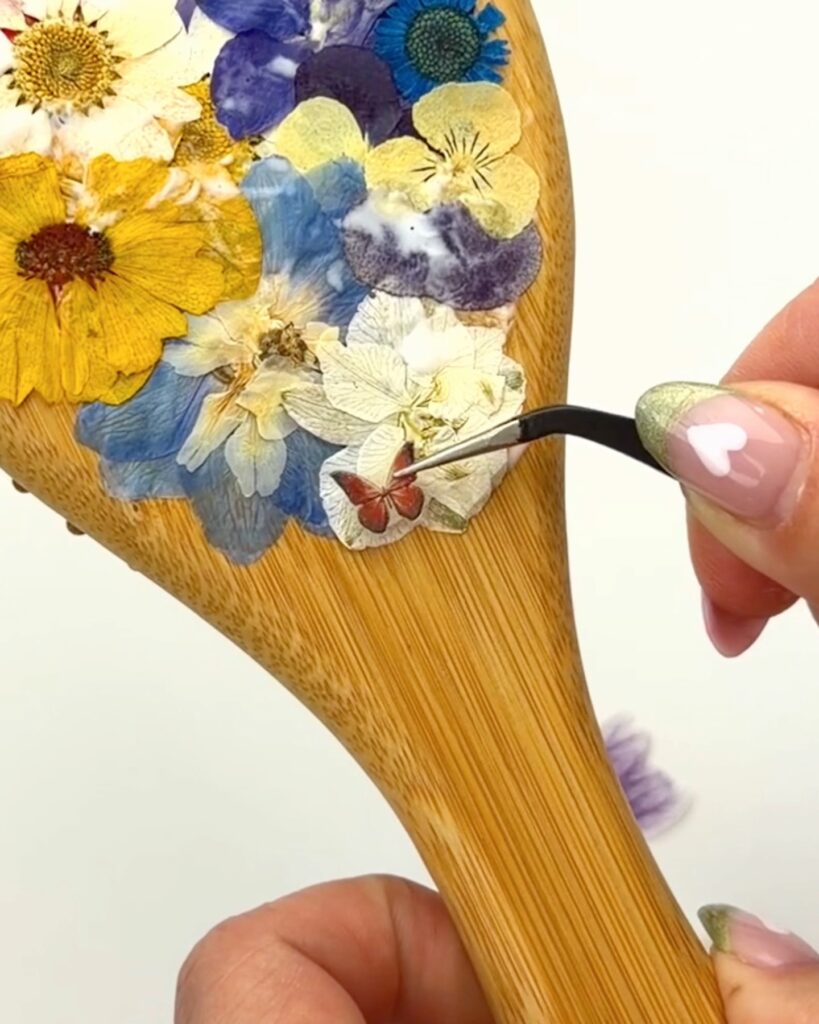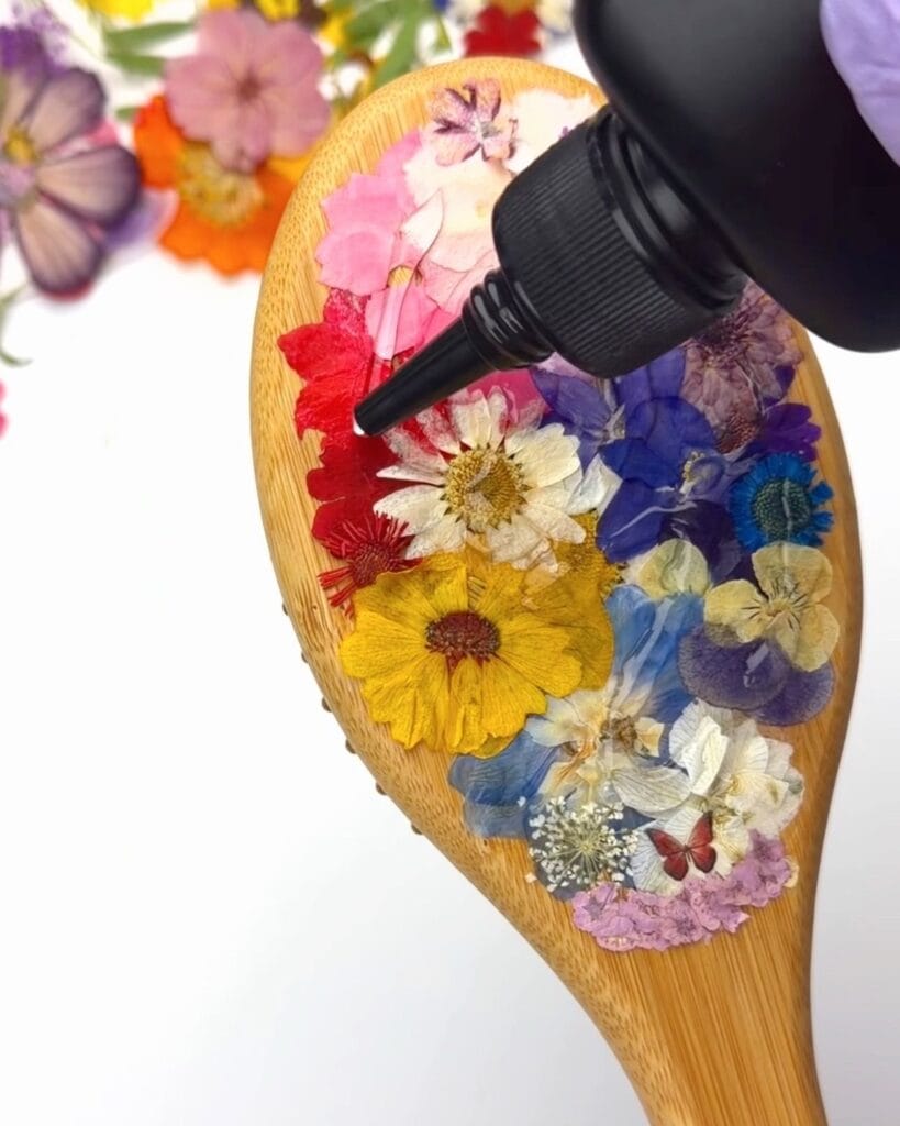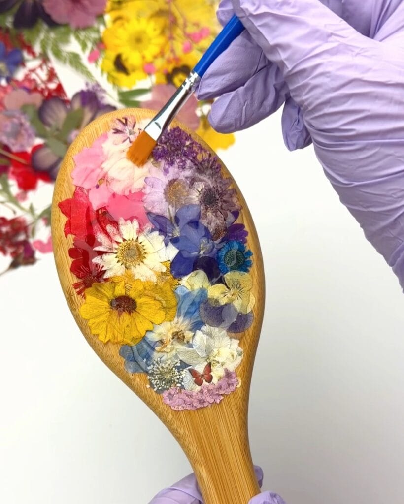 This pressed flower resin brush is proof that crafts do not have to be complicated to be beautiful. A few flowers, a little resin, and you have something that feels special and personal. Save this idea for your next craft night or gift project.